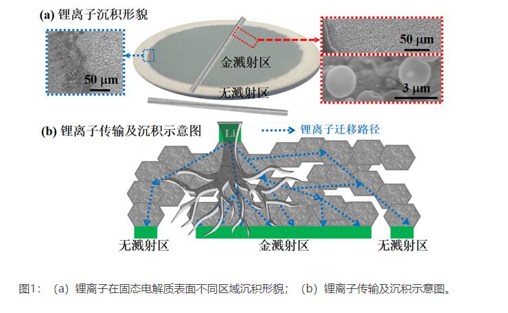為此,科研人員通過將電解質(zhì)兩側金屬鋰電極設計成互為垂直結構,構筑了非對稱結構的固態(tài)電池(圖1a),通過觀察鋰在電解質(zhì)表面沉積狀態(tài)來推斷鋰離子在電解質(zhì)內(nèi)部的傳輸過程。同時,在電解質(zhì)表層中心區(qū)域濺射Au原子層,通過與未濺射Au原子層區(qū)域相比較,獲取Au原子層對鋰離子沉積的影響規(guī)律。研究結果表明,電解質(zhì)表層的電子分布狀態(tài)會直接影響電解質(zhì)內(nèi)鋰離子的傳輸路徑(圖1b),使得來自電解質(zhì)上表層的鋰離子在電解質(zhì)內(nèi)呈發(fā)散狀傳輸。進一步分析發(fā)現(xiàn),在未濺射Au濺射區(qū),鋰離子沉積呈現(xiàn)為無規(guī)則區(qū)域富集分布狀態(tài)(圖1a中藍框內(nèi)左側區(qū)域),將誘導鋰枝晶生長進而誘發(fā)短路現(xiàn)象發(fā)生。而在濺射有Au原子層區(qū)域,鋰離子沉積呈現(xiàn)為均勻球形顆粒分布狀態(tài)(圖1a中紅框區(qū)域及藍框內(nèi)右側區(qū)域),有效抑制了由于鋰枝晶的生長帶來的鋰離子電池的安全隱患。該工作的開展為全固態(tài)電池界面性能優(yōu)化及安全性能提升提供了理論與實驗基礎。