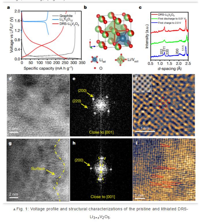 雖然無序巖鹽結(jié)構(gòu)的氧化物的形成之前已有文獻報道,但是在此之前沒有關于這一類電極材料嵌鋰用作負極材料的報道。作者通過恒流充放電發(fā)現(xiàn)無序巖鹽結(jié)構(gòu)氧化物Li3V2O5 的比容量為266 mAh/g(100 mA/g)(Fig. 1a)。