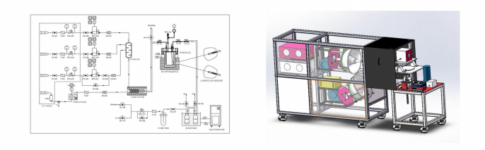 本裝置配置三路氣體進(jìn)料和一路液體進(jìn)料,使用聚光太陽能模擬裝置做為光源和熱源,高溫高壓反應(yīng)釜做為反應(yīng)器。可評價多種原料