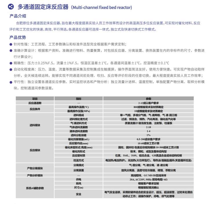 產(chǎn)品介紹: 合肥原位多通道固定床反應(yīng)器,旨在最大程度提高實(shí)驗(yàn)人員工作效率而設(shè)計(jì)的高溫高壓多位反應(yīng)裝置,可實(shí)現(xiàn)對催化材料、反應(yīng)評價(jià)和工藝優(yōu)化的快速、高效、平行篩選。各通道反應(yīng)器可選擇一體式、獨(dú)立式及快速切換式工作模式。 產(chǎn)品優(yōu)勢: 針對性強(qiáng):工藝流程、工藝參數(shù)追認(rèn)和標(biāo)準(zhǔn)件選型完全根據(jù)客戶需求定制; 準(zhǔn)確計(jì)算設(shè)計(jì):根據(jù)客戶資料,準(zhǔn)確進(jìn)行物料、熱增衡算,對包括反應(yīng)器、分離裝置、換熱裝置在內(nèi)的非標(biāo)件的尺寸、參數(shù)進(jìn)行計(jì)算設(shè)計(jì); 精確性:壓力±0.25%F.S,流量±1%F.S,恒溫區(qū)溫差±1℃,各通道間混差±1℃,控溫精度±0.1℃ 自動(dòng)化程度高:壓力、溫度、流量等數(shù)據(jù)采集及控制集成在觸摸屏,操作界面簡潔友好,使用方便快捷??蓪?shí)現(xiàn)產(chǎn)物自動(dòng)取樣分析,全天候連續(xù)運(yùn)轉(zhuǎn)。能夠?qū)崿F(xiàn)不同通道間前處理、吹掃、反應(yīng)等評價(jià)階段的任意切換,最大程度提高實(shí)驗(yàn)人員工作效率; 平行性:獨(dú)立設(shè)置各通道反應(yīng)參數(shù)、實(shí)時(shí)監(jiān)控狀態(tài)和產(chǎn)物分析:獨(dú)立流量計(jì)進(jìn)樣、溫度控制,單獨(dú)配置產(chǎn)物分離、取樣分析模塊,控制通道間參數(shù)誤差。