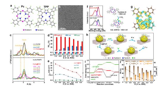 最近,在國(guó)家自然科學(xué)基金委、科技部和中國(guó)科學(xué)院的支持下,胡勁松課題組在氮摻雜碳類CO2RR催化機(jī)制研究方面取得重要進(jìn)展,發(fā)展了顯著提高其性能的新策略。氮摻雜碳基納米材料作為廉價(jià)非金屬CO2RR催化劑備受關(guān)注,但因其結(jié)構(gòu)復(fù)雜,難以精確控制,導(dǎo)致對(duì)其催化活性位點(diǎn)的認(rèn)識(shí)仍存在較大爭(zhēng)議,催化性能也亟待大幅提升。利用結(jié)構(gòu)明確的小分子作為模型催化劑是明晰其催化機(jī)制的有效手段,但小分子自身的催化活性低,實(shí)驗(yàn)誤差大,難以給出可信結(jié)果。研究人員發(fā)現(xiàn)將含氮小分子模型催化劑(酞菁(Pc)和四苯基卟啉(TPP),圖a)與超小鈷納米晶(圖b,c)結(jié)合,可以顯著提升其催化CO2RR的選擇性(法拉第效率,圖d)和活性(電流密度,圖e)(-0.9 V下分別提升18和47倍)。這種放大效應(yīng)使利用模型小分子揭示氮摻雜碳類材料的催化機(jī)制成為可能。實(shí)驗(yàn)結(jié)果與理論計(jì)算表明CO2RR優(yōu)先發(fā)生在吡啶氮而不是吡咯氮上(圖f-h);而且金屬態(tài)鈷可以顯著降低吡啶氮上CO2RR決速步驟的能壘,從而提升其催化性能(圖i)。電化學(xué)實(shí)驗(yàn)進(jìn)一步證實(shí)含吡啶氮的酞菁分子催化CO2RR的活性和選擇性都比只含吡咯氮的卟啉分子在相同氮含量下高出數(shù)倍(圖j)。這些結(jié)果揭示了氮摻雜碳類催化劑中吡啶型氮碳位點(diǎn)電催化還原CO2性能明顯高于吡咯氮摻雜碳位點(diǎn),并且通過(guò)調(diào)控吡啶型氮碳位點(diǎn)電子結(jié)構(gòu)可以顯著提升其催化活性與選擇性。該研究工作為合理設(shè)計(jì)高效、低成本CO2RR碳基電催化劑提供了有益的參考,相關(guān)結(jié)果發(fā)表于德國(guó)應(yīng)用化學(xué)(Angew. Chem. Int. Ed.2020, Doi: 10.1002/anie.201916520),并被選為VIP論文。論文第一作者是博士生何超。