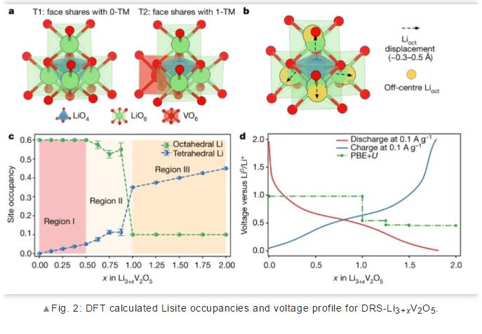 X射線衍射和中子衍射協(xié)同精修結(jié)果顯示Li3+xV2O5為無序巖鹽結(jié)構(gòu),晶格常數(shù)為4.095 A。氧離子完全占據(jù)四面體4a位;八面體4b位由52%的Li離子和40%的V離子共同占有;并且有4%的Li離子占據(jù)四面體8c位。根據(jù)表征結(jié)果結(jié)合DFT計算,Li3+xV2O5的結(jié)構(gòu)可寫作[□9.6Li0.4]8c [□0.4Li2.6V2]4b[O5]4a(□為空位),該結(jié)構(gòu)中的四面體位置有充足空位可用于容納更多的鋰離子。原位X射線衍射實驗和非原位中子衍射結(jié)果顯示Li3+xV2O5在繼續(xù)嵌鋰過程中僅有5.9%的晶胞體積膨脹,表明該材料的嵌鋰結(jié)構(gòu)穩(wěn)定。掃描透射電鏡的表征也驗證了衍射實驗的結(jié)果(Fig.1)。X射線吸收光譜證明該材料的電極反應完全是來自于V離子氧化還原,并且該反應具有良好的可逆性。 結(jié)合密度泛函理論計算,作者發(fā)現(xiàn)Li3+xV2O5在起始嵌鋰時鋰離子會優(yōu)先嵌入四面體位置。當x=1時,四面體位鋰離子之間的靜電力會導致部分八面體位置的鋰離子位移至其他四面體位。這時鋰離子在八面體位置的占有率驟降到10%,而在四面體位置的占有率上升至35%。在后續(xù)的嵌鋰過程中(1≤x≤2),八面體位置的鋰離子占有率維持不變,四面體位置的鋰離子占有率逐漸上升(Fig.2)。這一現(xiàn)象不同于鈦酸鋰和錳酸鋰的嵌鋰機理。