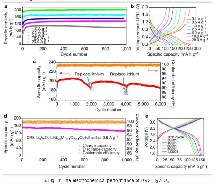 無序巖鹽結(jié)構(gòu)氧化物 Li3+xV2O5負極擁有優(yōu)異的電化學性能。在100 mA/g的電流密度下,比容量約為266 mA/g,平均反應電壓為0.6V。在20A/g的電流密度下(20 s完成充/放電),比容量依舊可以保持在109 mA/g。在1A/g的恒定電流循環(huán)6000次后,材料容量沒有明顯衰減。在與NMC811組成的全電池測試中,平均庫倫效率大于99.98%,在1000次循環(huán)后容量保持在86.9% (Fig.3)。