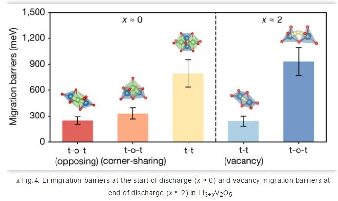 為了研究Li3+xV2O5的快充機理,作者通過NEB計算研究了Li3V2O5和Li5V2O5不同鋰離子傳輸路徑的擴散勢壘 (Fig. 4)。在Li3V2O5中,鋰離子傳輸是由【四面體位-共面八面體位-共面四面體位】(t-o-t)的協(xié)同躍遷所達成的。當兩個額外的鋰離子嵌入結(jié)構(gòu)后(Li5V2O5),鋰離子重新分布導致八面體位置中的Li/V占有率從100%降為50%(40% V,10% Li)。這時鋰離子最優(yōu)傳輸路徑從t-o-t的協(xié)同躍遷轉(zhuǎn)變成【四面體位-四面體位】的直接躍遷。這一機理闡明了Li3+xV2O5快速鋰離子傳導的原因。