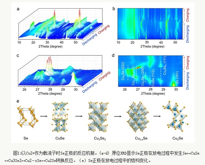 曲良體教授團(tuán)隊(duì)與北京理工大學(xué)張志攀教授、中國科學(xué)院力學(xué)研究所劉峰副研究員等制備了一系列Se@C正極材料,以Cu2+為正極的載流子,以Cu或者Zn為負(fù)極,組裝電池進(jìn)行電化學(xué)性能測試。通過原位XRD、非原位XRD、非原位TEM、非原位XPS等表征技術(shù)研究Se正極在充放電過程中發(fā)生的變化。通過恒電流間歇滴定法(GITT)研究了Cu2+在充放電過程中的擴(kuò)散系數(shù)。