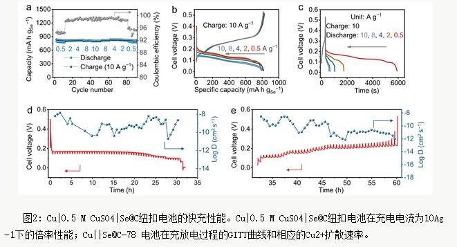 由于在充放電過程中的中間產(chǎn)物難溶于水,因此可以從根源上避免有機(jī)系Se基電池中多硒化物的穿梭效應(yīng)。Cu|0.5 M CuSO4|Se@C-48紐扣電池能夠在5分鐘內(nèi)充電800 mAh gSe?1(充電電流10 A g?1)。且當(dāng)Se@C中Se含量提高至65%時(shí),電池的快充性能無明顯變化(圖2)。Zn|0.5 M ZnSO4 ||0.5 CuSO4 |Se@C全電池可以在9分鐘內(nèi)的充電到900 mAh gSe?1,顯示出具有發(fā)展為快充電池的潛力(圖3)。第一性原理計(jì)算表明,放電中間產(chǎn)物具有優(yōu)異的電子導(dǎo)電率,此外,充放電過程中的體積效應(yīng)能夠促進(jìn)充放電速率。