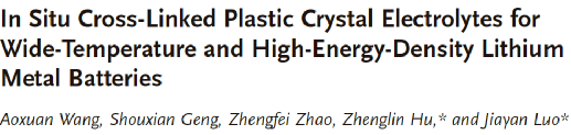 Aoxuan Wang, Shouxian Geng, Zhengfei Zhao, Zhenglin Hu, Jiayan Luo, In Situ Cross-Linked Plastic Crystal Electrolytes for Wide-Temperature and High-Energy-Density Lithium Metal Batteries, Advanced Functional Materials, 2022, https://doi.org/10.1002/adfm.202201861