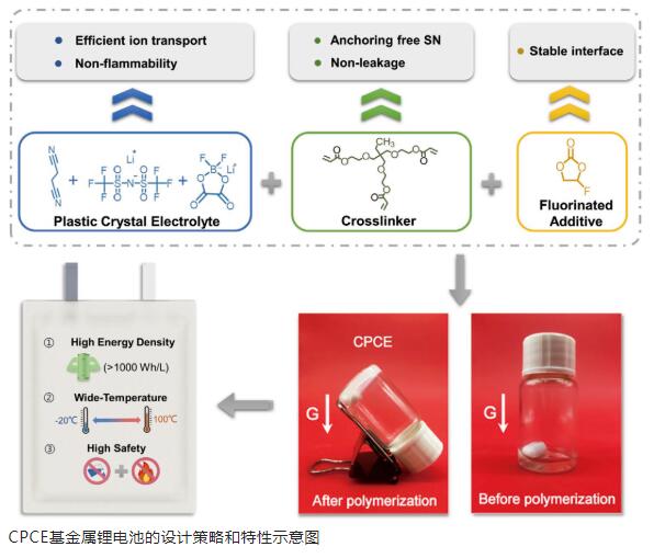 本文中作者展示了一種原位交聯(lián)塑料晶體基電解質(zhì)(CPCE),由于其高效的離子傳輸和增強(qiáng)的界面相容性,具有高安全性和較寬的溫度使用范圍,適用于高能量密度鋰金屬電池。