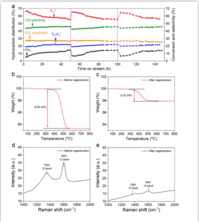 實(shí)驗(yàn)中我們發(fā)現(xiàn)可以通過(guò)簡(jiǎn)單的提高壓力操作讓催化劑再生。即在反應(yīng)進(jìn)行50 h后,將反應(yīng)氣總壓力升至30 bar,并保持4 h,然后再降回1 bar,這時(shí)C4+=選擇性就能夠恢復(fù)至65.2%。我們進(jìn)行了多次再生操作,催化劑每次都能恢復(fù)C4+=的高選擇性。為了探究再生機(jī)制,我們進(jìn)行了熱重和拉曼光譜分析。N2氣氛中的熱重結(jié)果顯示再生前催化劑的失重為6.62 wt%,而再生后催化劑的失重為2.02 wt%。拉曼光譜也顯示再生后的催化劑表面的無(wú)序碳和石墨碳含量遠(yuǎn)低于再生前的催化劑。所以我們認(rèn)為高壓處理祛除了表面烴類(lèi)和碳物種,使活性位點(diǎn)得以重新暴露從而使催化劑恢復(fù)了活性。并且,通過(guò)元素分析,我們發(fā)現(xiàn)失活的催化劑Cu和Fe分相比較嚴(yán)重,而再生后的催化劑Cu和Fe元素重疊部分更多。
