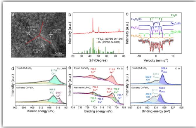 為了深入研究活性位點(diǎn)和物相結(jié)構(gòu),研究人員對(duì)活化的CuFeO2進(jìn)行了多種結(jié)構(gòu)表征。高分辨電鏡觀測(cè)到了Cu(111)、Fe3O4(311)和χ-Fe5C2(11-2)三種晶面,并能觀察到明顯的晶面交界。XRD譜的特征峰被歸屬于金屬Cu和χ-Fe5C2,為了進(jìn)一步厘清Fe的物相,我們進(jìn)行了穆斯堡爾譜的表征,其結(jié)果顯示鐵的物相包括Fe3O4、χ-Fe5C2和Fe3C,它們的比例分別為16.6%、73.6%和9.8%。XPS表征得到的元素價(jià)態(tài)結(jié)果基本和物相結(jié)論相符。