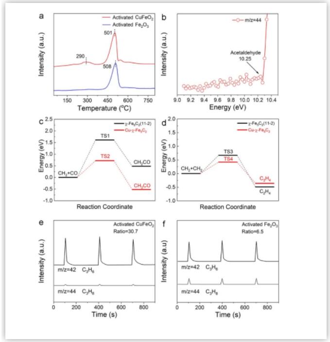 為了探索在常壓下C4+=烯烴高選擇性的原因,我們進(jìn)行了原位表征和理論計(jì)算相結(jié)合的方法來(lái)研究?jī)?nèi)在機(jī)制。CO-TPD實(shí)驗(yàn)證明了活化的CuFeO2存在CO非解離吸附和解離吸附兩種活性位點(diǎn),說(shuō)明可能存在CO插入機(jī)制。同步輻射真空紫外光電離飛行時(shí)間質(zhì)譜檢測(cè)到微量含氧產(chǎn)物乙醛,也側(cè)面印證了CO插入機(jī)制的存在。理論計(jì)算的結(jié)果表明在Cu-χ-Fe5C2界面處發(fā)生CO插入的反應(yīng)能壘遠(yuǎn)低于單獨(dú)的Fe5C2,并且其CH2偶聯(lián)的反應(yīng)能壘也低于單獨(dú)的Fe5C2。丙烯脈沖的實(shí)驗(yàn)表明對(duì)比與普通鐵基催化劑,界面催化劑對(duì)烯烴的二次吸附和加氫能力都很弱導(dǎo)致了產(chǎn)物的高烯烷比。