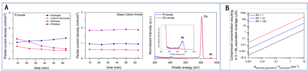 圖2.(A) 在Cu(100)面上鉑陽極、玻碳陽極活性-時(shí)間關(guān)系(-1.0 V vs RHE),兩種陽極獲得的LEIS光譜;(B) 根據(jù)幾何陰極表面積與電解液體積的比率以及陰極表面的粗糙度系數(shù),計(jì)算出覆蓋電催化劑表面10%所需的電解液雜質(zhì)濃度.