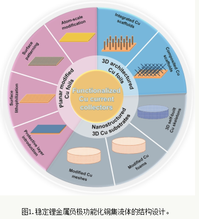 基于功能化銅集流體的設(shè)計理念和工作機(jī)制,本文系統(tǒng)性綜述了近年來功能化銅集流體在長循環(huán)、無枝晶鋰金屬負(fù)極開發(fā)中的研究進(jìn)展。首先,對鋰金屬電池失效的關(guān)鍵因素和挑戰(zhàn)進(jìn)行了詳細(xì)梳理,闡明了銅集流體改性的必要性以及亟待解決的主要問題。隨后,從銅集流體的結(jié)構(gòu)化設(shè)計角度將其功能化策略分為三類(圖1),包括: