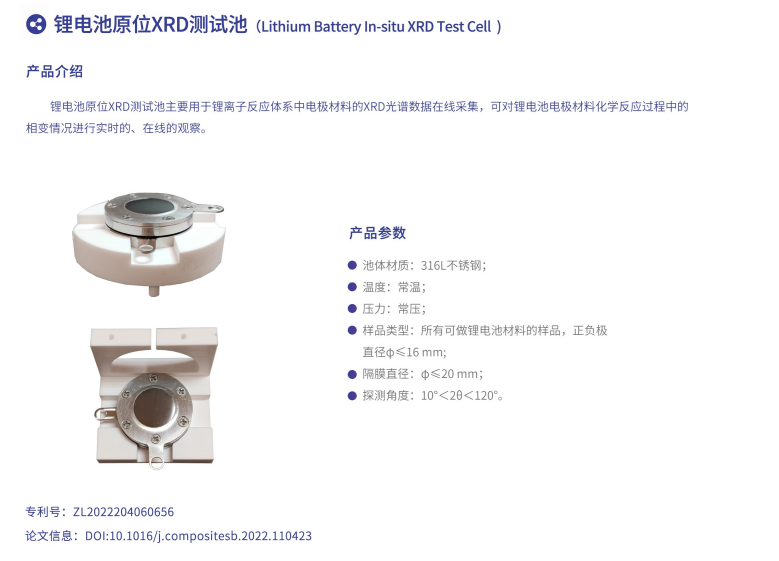 鋰電池原位XRD測試池主要用于鋰離子反應體系中電極材料的XRD光譜數(shù)據(jù)在線采集,可對鋰電池電極材料化學反應過程中的相變情況進行實時的、在線的觀察。