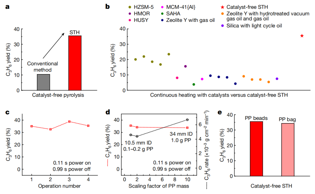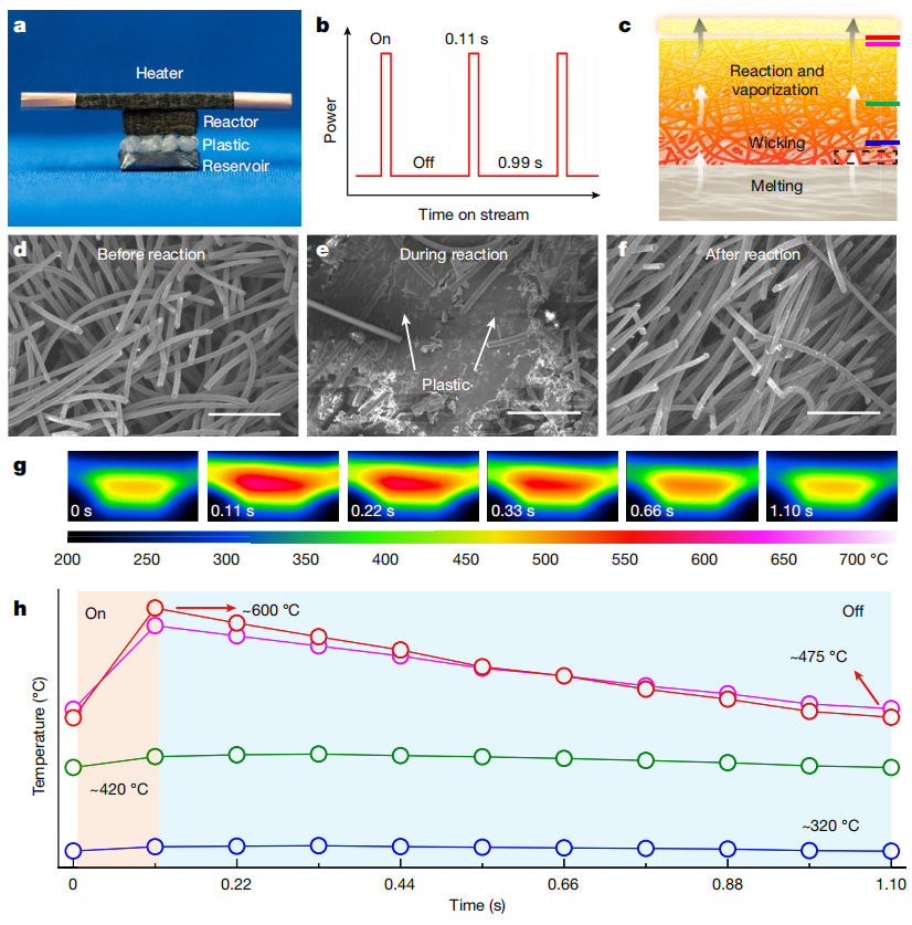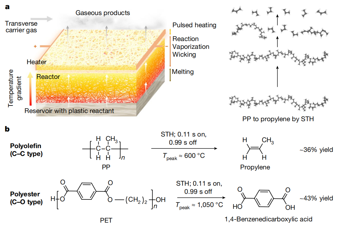 有鑒于此,美國馬里蘭大學(xué)胡良兵教授研究團(tuán)隊(duì)和普林斯頓大學(xué)琚詒光教授研究團(tuán)隊(duì)聯(lián)合提出了一種基于電致焦耳加熱的時空溫度控制(STH)手段,可用于連續(xù)、高選擇性、高效率塑料熱解反應(yīng),用于制備高附加值產(chǎn)物如單體、燃料等。此項(xiàng)研究基于該團(tuán)隊(duì)于2022年提出的可編譯電致焦耳脈沖加熱應(yīng)用于氣相反應(yīng)物熱化學(xué)轉(zhuǎn)化的技術(shù)(Qi Dong et al., Programmable heating and quenching for efficient thermochemical synthesis, Nature 2022, 605, 470-476),通過對多孔碳材料即焦熱加熱源進(jìn)行簡單的多層設(shè)計(jì),構(gòu)建了一種可同時控制溫度梯度和脈沖加熱次序的反應(yīng)器結(jié)構(gòu)。當(dāng)從固態(tài)塑料反應(yīng)物出發(fā)時,該設(shè)計(jì)通過電致加熱可以在層狀多孔反應(yīng)器中產(chǎn)生連續(xù)熔化、虹吸、氣化和分解的過程,將塑料高分子熱解為小分子。研究人員采用聚丙烯和聚對苯二甲酸乙二酯為例,在無需添加任何催化劑的條件下,通過該設(shè)計(jì)可以降低高不飽和度產(chǎn)物的形成并取得40%左右的單體產(chǎn)率,遠(yuǎn)高于多數(shù)同類反應(yīng)中含催化劑的體系(多低于25%)。值得一提的是,該方法采用電能對體系進(jìn)行脈沖加熱,不僅降低碳排放,同時通過在毫秒時間尺度中高低溫切換的方式獲得較高的能量效率。基于這項(xiàng)工作,胡良兵教授、琚詒光教授和董麒博士共同創(chuàng)辦了初創(chuàng)公司Polymer-X Inc.。公司致力于對該技術(shù)進(jìn)行產(chǎn)業(yè)化,將其應(yīng)用于綠色化學(xué)品制備和材料回收。