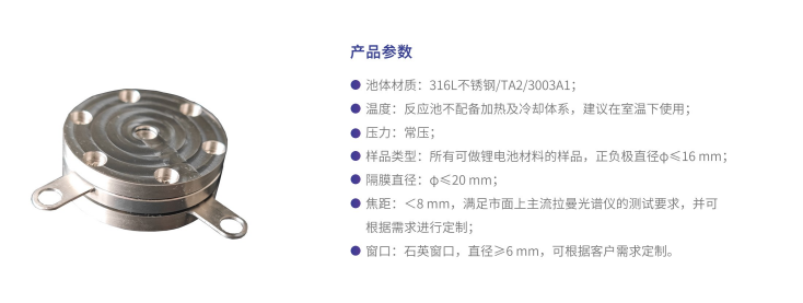 鋰電池原位拉曼測試池主要用于鋰離子反應體系中材料的拉曼光譜數(shù)據(jù)采集,可對鋰電池電極材料化學反應過程中的電極結(jié)構(gòu)進行研究。 產(chǎn)品參數(shù): 池體材質(zhì):316L不銹鋼/TA2/3003A1; 溫度:反應池不配備加熱及冷卻體系,建議在室溫下使用; 壓力:總壓; 樣品類型:所有可做鋰電池材料的樣品,正負極直徑φ≤16mm; 隔膜直徑φ≤20mm; 焦距:< 8mm,滿足市面上主流拉曼光譜儀的測試要求,并可根據(jù)需求進行定制; 窗口:石英窗口,直徑≥6mm,可根據(jù)客戶需求定制。