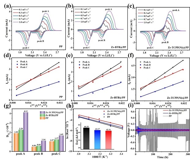 圖5 (a) PP, (b) Zr-BTB, (c) Zr-TCPP(Ni)@PP電池在不同掃描速率下的CV曲線。(d) PP (e) Zr-TCPP(Ni)@PP和(f) Zr-TCPP(Ni)@PP電池的A、B和C峰值電流的線性擬合。(g) 基于Randles-Sevcik方程的斜率值。(h) Zr-TCPP(Ni)@PP、Zr-BTB@PP和PP電池的溫度依賴性Arrhenius圖及相應(yīng)的活化能。(i) 在1 mA cm-2和2 mA h cm-2條件下,使用Zr-TCPP(Ni)@PP、Zr-BTB@PP和PP隔膜的Li||隔膜||Li電池中,Li+剝離/電鍍的性能。